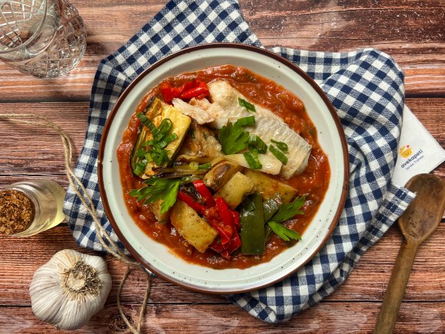 Lieu, poivron, courgette, haricot plat, pomme de terre, tomate, oignon, ail, cive, estragon, menthe, coriandre, persil, citron, concentré de tomates, huile d'olive, vinaigre balsamique, paprika, poivre, sel